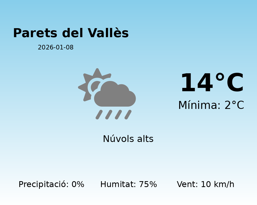 Avui, dia 8 de gener de 2026, Parets del Vallès gaudirà d’un dia relativament tranquil en termes meteorològics. Les temperatures es mouran entre una mínima de 2 graus durant les primeres hores del matí i una màxima de 14 graus a la tarda.