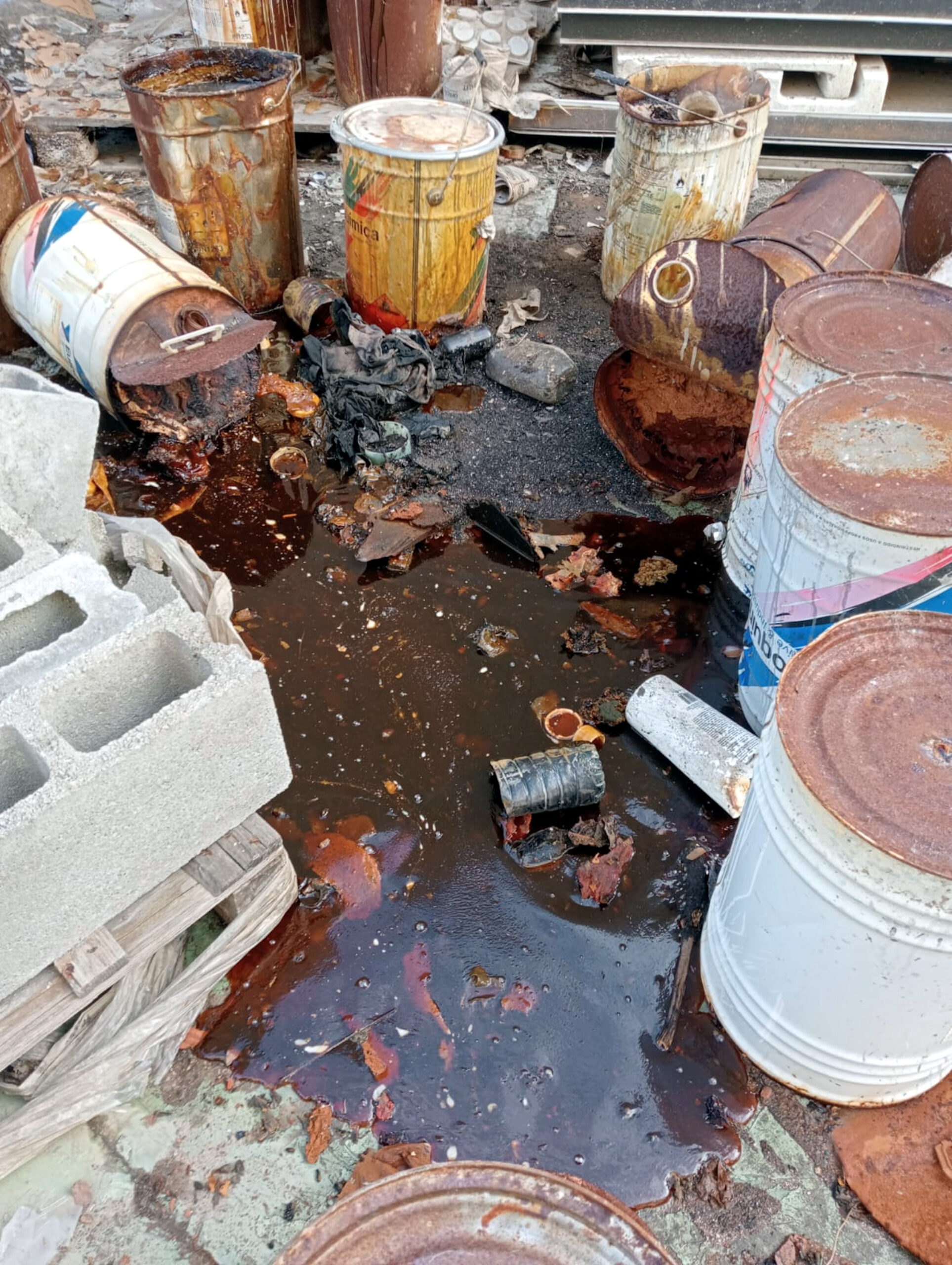 Durant la inspecció del solar, van localitzar apilaments de recipients metàl·lics i de plàstic de diferents capacitats, etiquetats com a residus perillosos. A més, van trobar zones irregulars de terra sense pavimentar que desprenien una forta olor a dissolvent i vessaments de pintures. Aquest productes, segons els Mossos, s’infiltraven per les escletxes del paviment i entre blocs de formigó del mur perimetral.