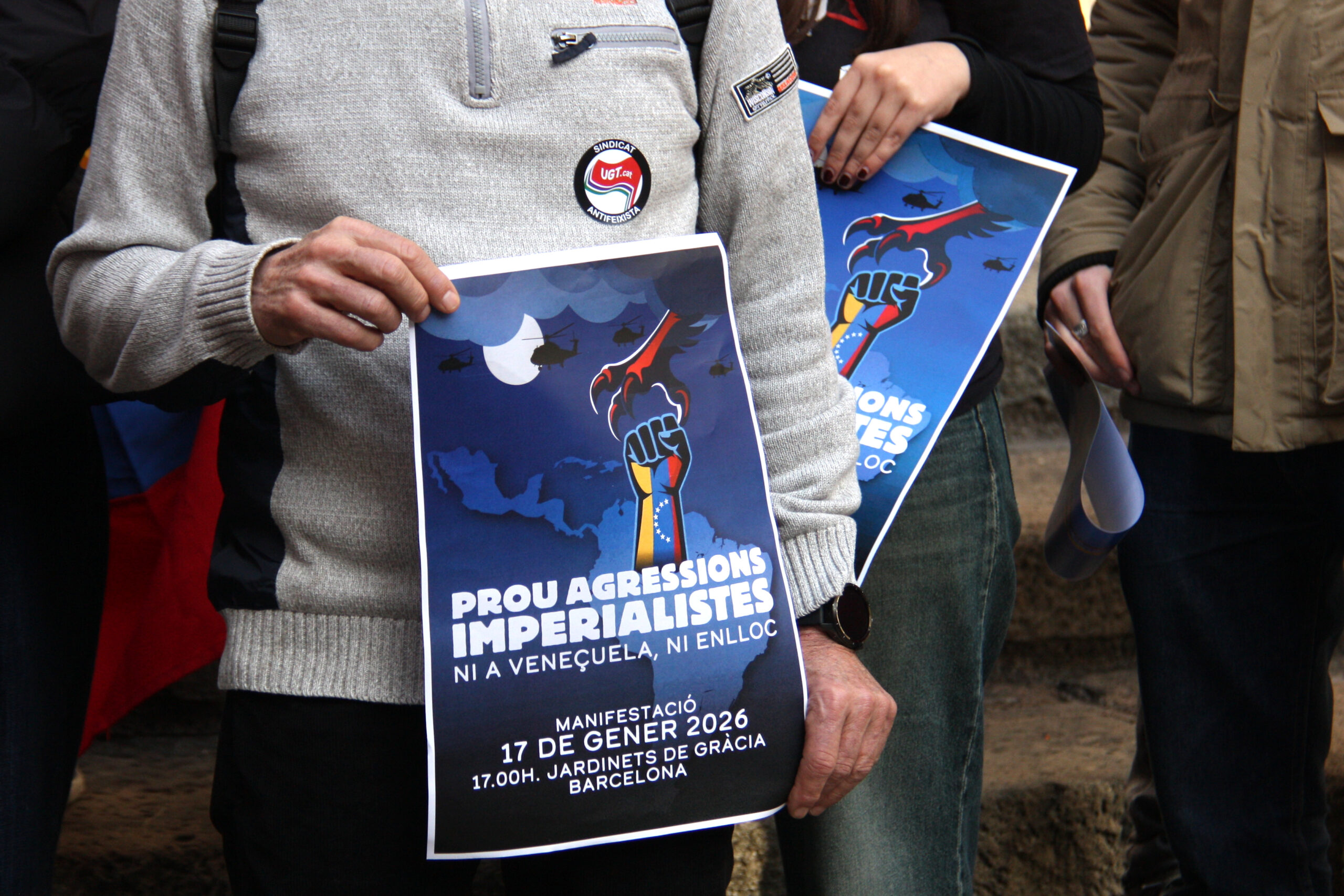 ACN Barcelona – La manifestació unitària contra “l’agressió imperialista” a Veneçuela s’ha suspès pel temporal de pluja i pel risc de desplaçaments. La concentració havia de començar aquest dissabte a les 17.00 hores als Jardinets de Gràcia de Barcelona i comptava amb més de 80 adhesions de col·lectius i organitzacions de Catalunya. La CUP ha detallat que s’informarà pròximament de la nova convocatòria. Amb el lema ‘Prou agressions imperialistes. Ni a Veneçuela ni enlloc”, la manifestació se celebrava “en defensa de la sobirania de la República Bolivariana de Veneçuela” i contra “l’agressió imperialista” dels EUA a l’Amèrica Llatina. També exigia la posada en llibertat immediata del president Nicolás Maduro i de la seva esposa i diputada Cilia Flores.